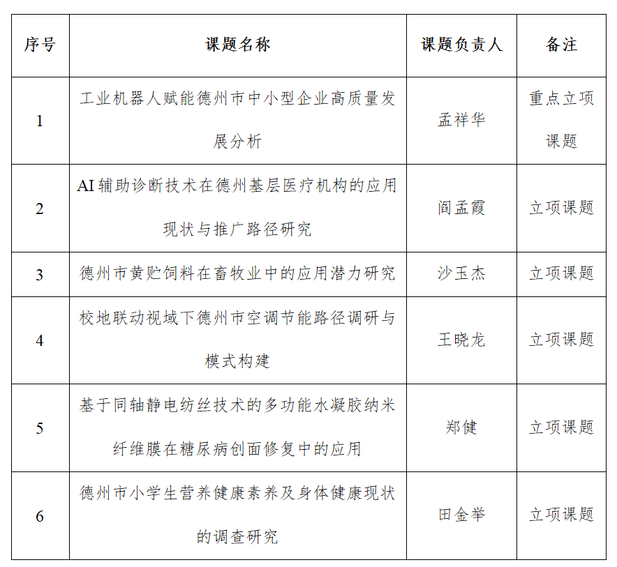 近日,德州市科学技术协会公布了2025年度德州市科协智库调研课题立项名单,太阳成官网6项课题获批立项,其中1项课题为重点立项课题。