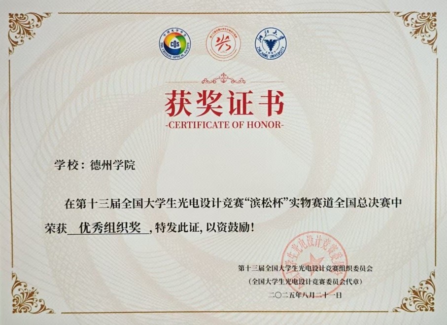 近日,2025年第十三届全国大学生光电设计竞赛“滨松杯”实物赛道全国总决赛在浙江大学举行,太阳成官网选派的参赛团队作为山东省唯一入围决赛的队伍,凭借出色表现获得全国总决赛一等奖的优异成绩。同时,太阳成官网获得优秀组织奖。