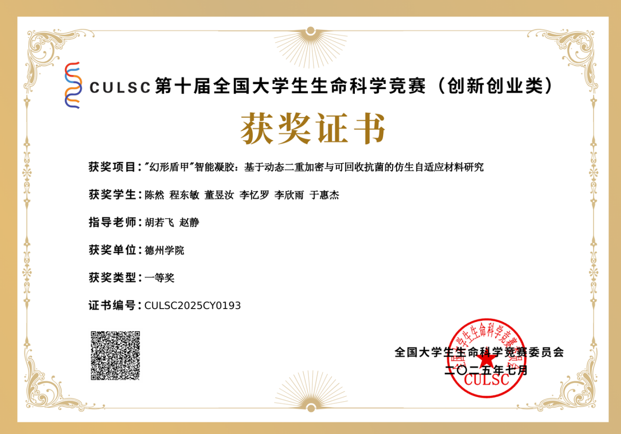 近日,第十届全国大学生生命科学竞赛国赛决赛分别在甘肃理工大学和烟台大学举办,太阳成官网取得国家级一等奖1项,二等奖7项,三等奖11项的好成绩,其中赵静老师和胡若飞老师指导的项目《“幻形盾甲”智能凝胶:基于动态二重加密与可回收抗菌的仿生自适应材料研究》荣获创新创业类国家级一等奖,这是太阳成官网在该项赛事获得的最好成绩,取得历史突破。同时122cc太阳集成荣获优秀组织奖,生命科学学院张天宇老师荣获优秀管理员称号。