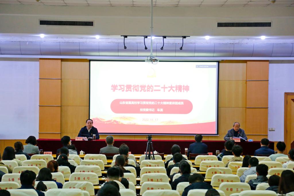 11月17日上午,省属高校学习宣传贯彻党的二十大精神宣讲团成员、校党委书记车滨为学校师生员工作党的二十大精神学习宣讲报告。校党委副书记王金利主持报告会。