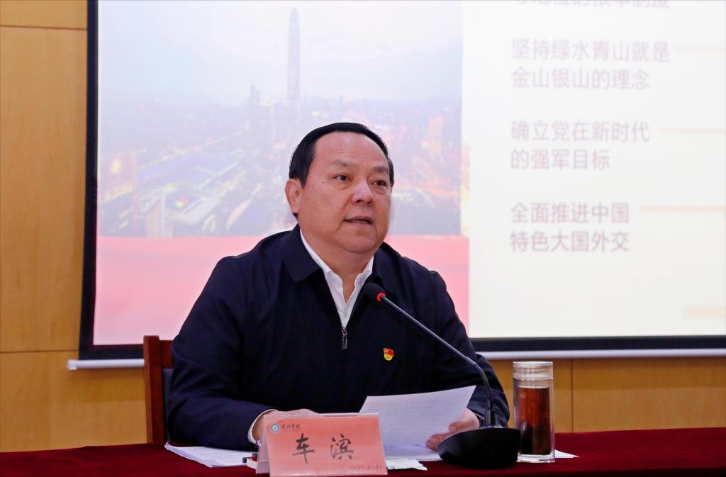 报告会上,车滨阐述了党的二十大的主题、主要成果,讲解了过去5年的工作和新时代10年的伟大变革,阐释了马克思主义中国化时代化、中国式现代化的中国特色和本质要求,解读了全面建设社会主义现代化国家的目标任务、坚持党的全面领导和全面从严治党的重大部署、应对风险挑战的重要要求。围绕“七个讲清楚”谈了学习认识和体会,与大家共同学习交流。