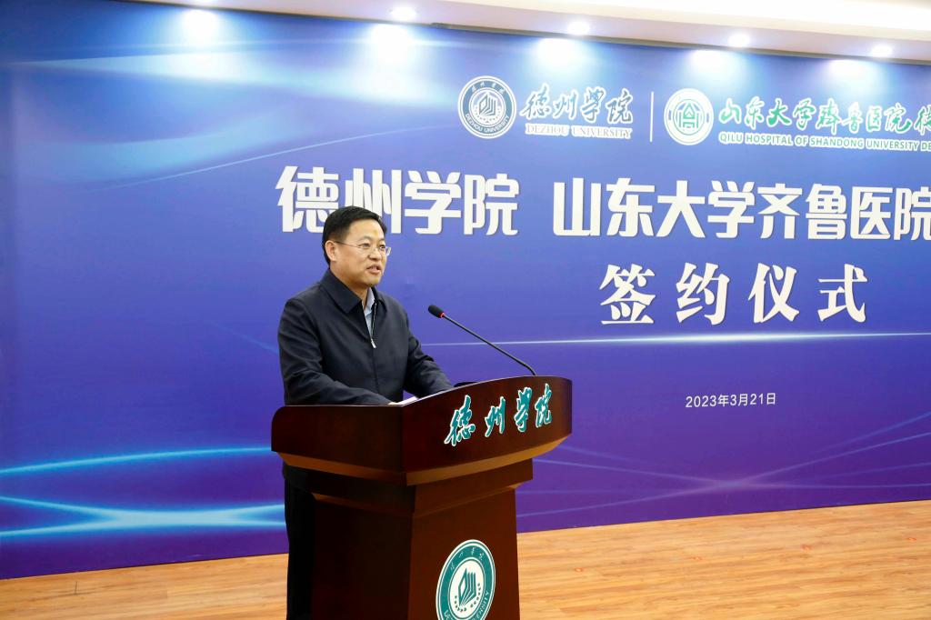 马广峰代表德州市委、市委人才工作领导小组,对双方携手合作和这次签约活动表示热烈祝贺,对各位领导、各位专家长期以来给予德州的关心支持表示衷心感谢。他表示,今天双方签署协议、强强联合,既是学校和医院发展史上的一件大事、喜事,更是增进全市民生福祉的一件实事、好事;既为学校医院“一域”争光,更为德州发展“全局”添彩。市委、市委人才工作领导小组将竭诚为各位专家提供最好的资源、最优的政策、最佳的环境,竭尽全力支持和保障双方合作项目的顺利实施。希望双方以这次合作为契机,主动作为、全面发力,切实把市委部署转化为推动经济社会发展的实际成效。要坚持聚焦重点,围绕医疗卫生临床需求和人民群众健康需要,加强护理学、生物制药、公共卫生、预防医学等特色专业和急需学科建设,推进国家级、省级医学重点学科和重点实验室建设,不断提升德州总体医疗水平和临床服务能力;要坚持资源互补,围绕高层次人才引进、医学人才培养、联合科技攻关等关键环节,充分发挥各自优势,积极探索产教融合、医工交叉的有效途径,深入开展全方位、多领域务实合作;要坚持互利共赢,围绕国家区域医疗中心、生物医药专业硕士点、住院医师规范化培训基地建设等目标任务,全面打通医校协同发展通道,同向发力、凝聚合力,为全市教育卫生事业高质量发展作出新的更大贡献。