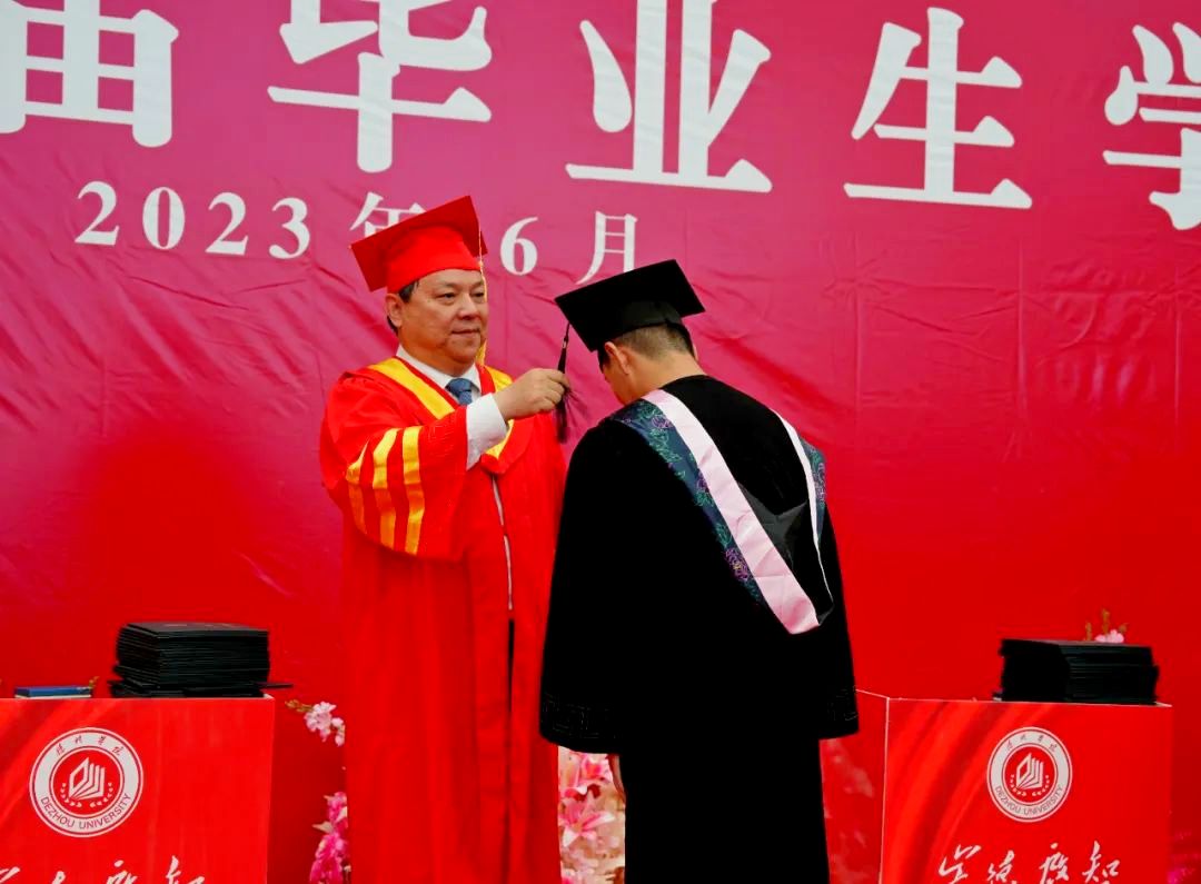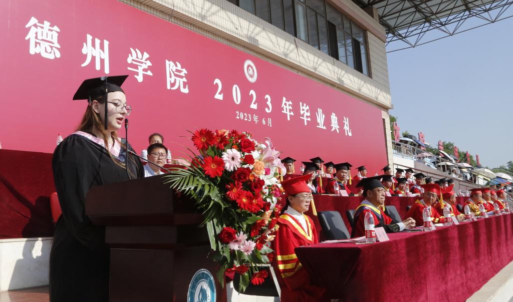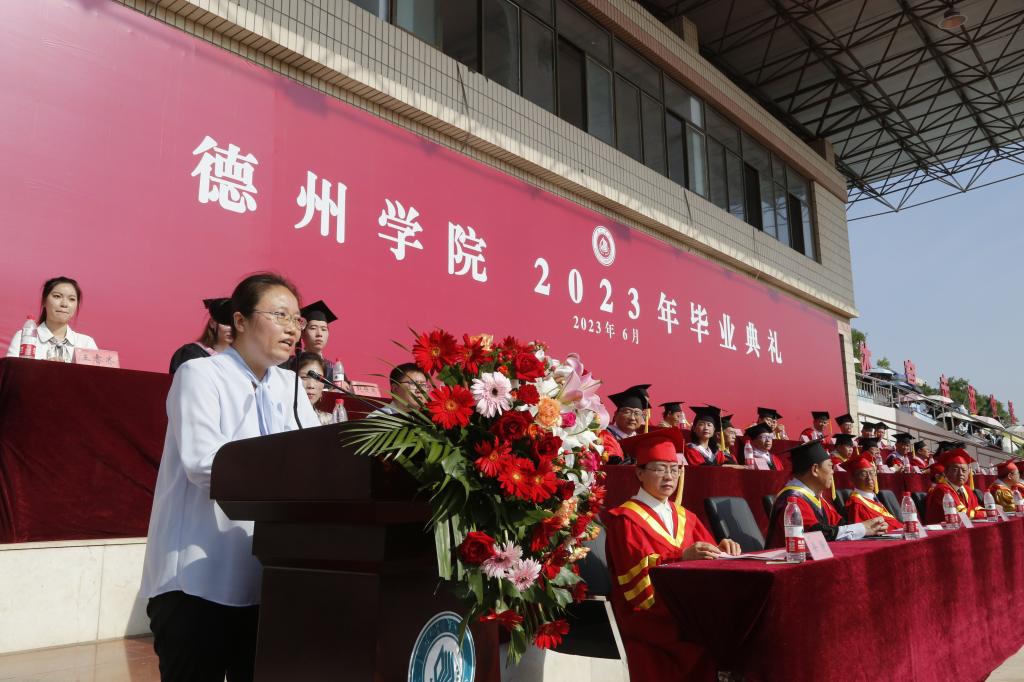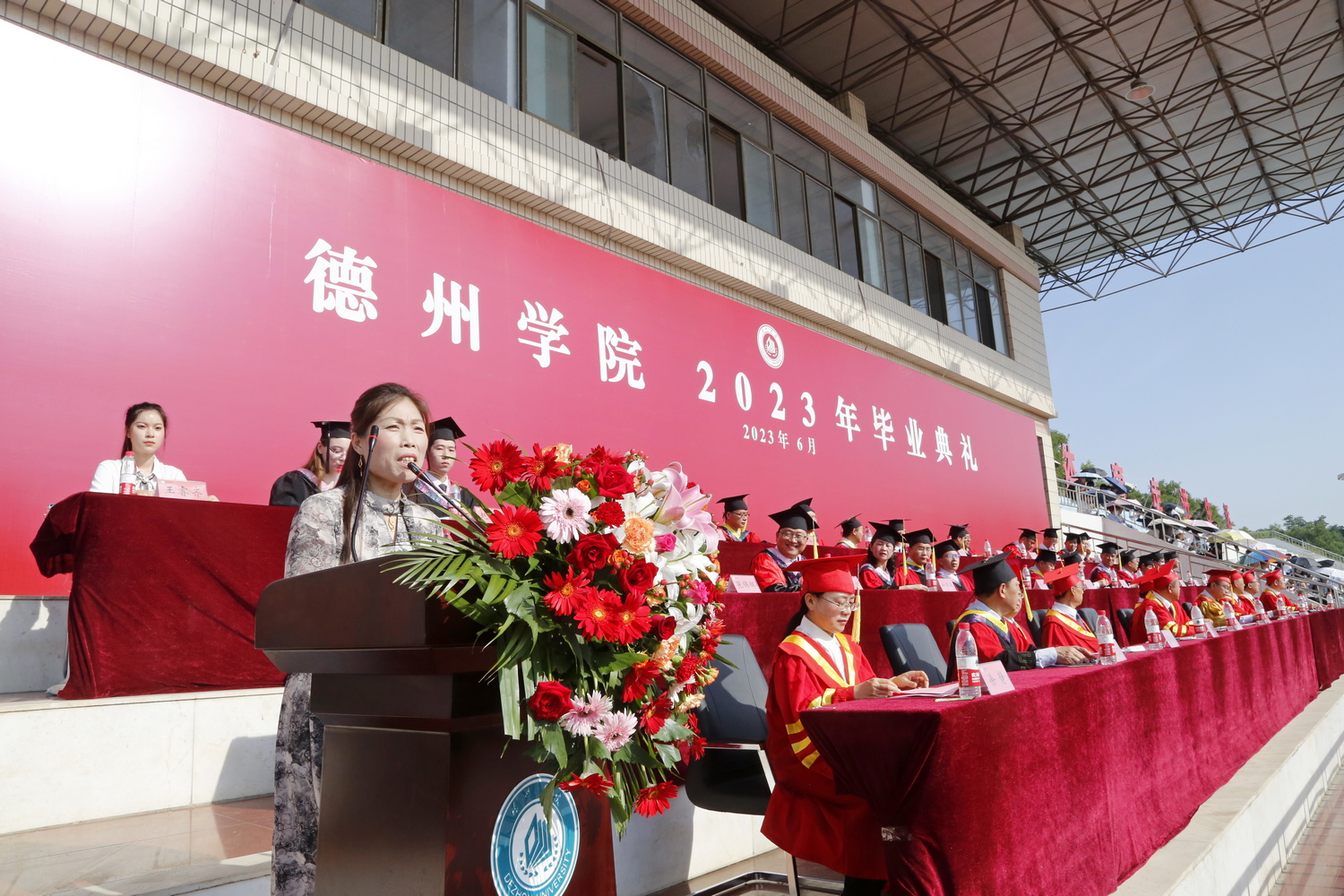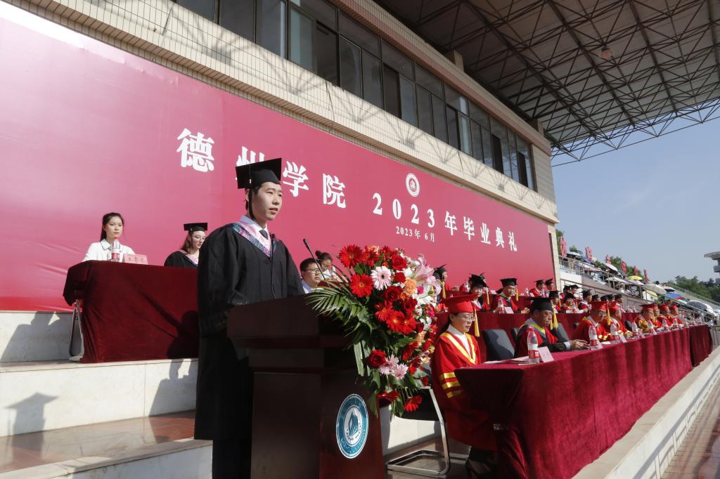 毕业典礼上,赵长林致辞。他首先对2023届毕业生顺利毕业表示祝贺,向为学生成长成才辛勤付出的老师、广大教职员工和学生家长,致以崇高的敬意和衷心的感谢。他说,岁月如歌、光阴飞逝,美好的求学时光转瞬成为难忘的青春回忆。四年的大学时光你们用自己奋斗的青春,深刻诠释了“崇德启智、励志博学”校训,用自己的行动践行了“艰苦奋斗,自强不息”的德院精神,德院正是因为拥有、汇集了一代代学子的亮丽青春,才会永葆青春,事业日新。