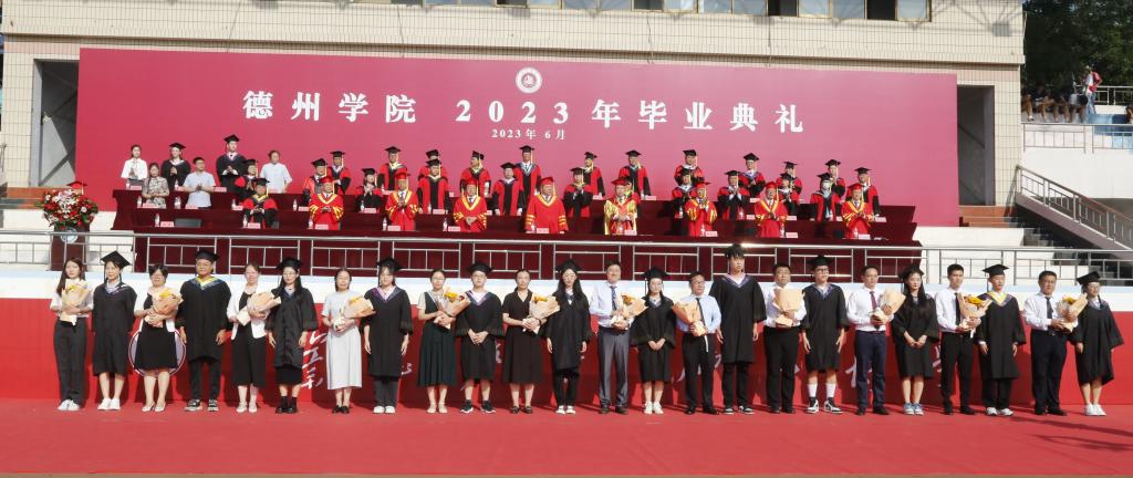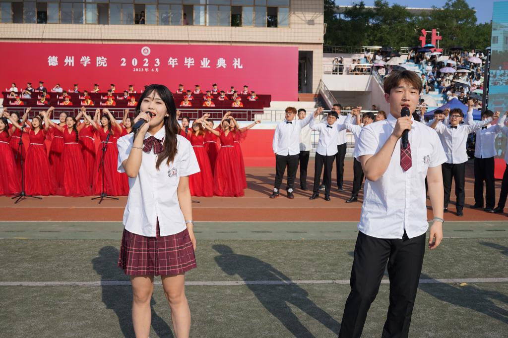 毕业典礼现场气氛热烈,学校为毕业生准备了精彩的暖场节目,以视频、MV、现场歌曲演唱的形式,回顾了大学生活的点点滴滴,春花夏蝉,秋月冬雪,一幕幕德院美好回忆在此刻翻涌。歌曲《New boy》《星辰大海》《起风了》《同桌的你》《萱草花》等节目,真情流露,烘托出离别不舍的氛围。