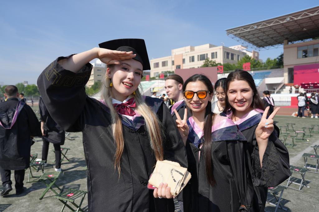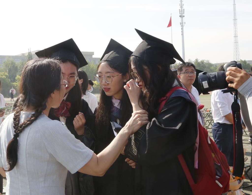 学位授予仪式上,校领导为毕业生代表逐一拨穗正冠,颁发学位证书并合影留念。