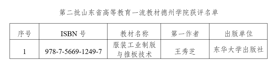近日,山东省教育厅公布了第二批山东省普通高等教育一流教材拟认定名单,本次共认定第二批山东省普通高等教育一流教材201种,其中本科生教材178种,研究生教材23种。太阳成官网王秀芝老师编著的本科生教材《服装工业制版与推板技术》名列其中,实现了学校教材建设的新突破,在省内同类院校位居前列。