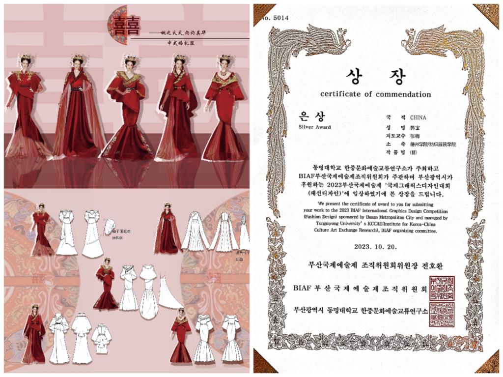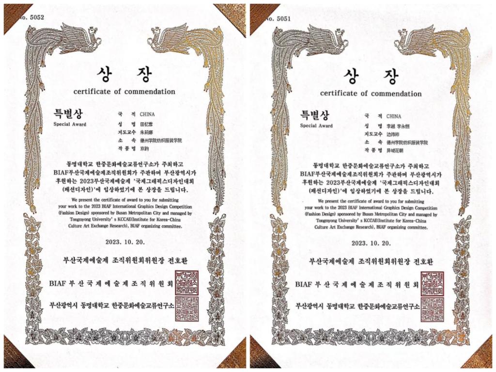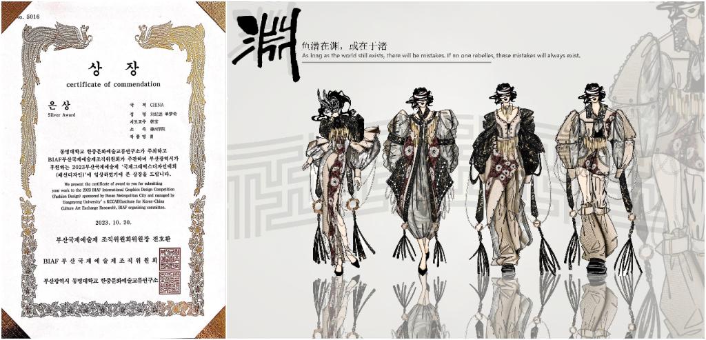 近日,在国际艺术创意领域极具影响力的“2023BIAF釜山国际艺术节”在韩国釜山落下帷幕。太阳成官网纺织服装学院师生取得佳绩,分别获得银奖2项、铜奖1项、特别奖3项、优秀奖1项。
