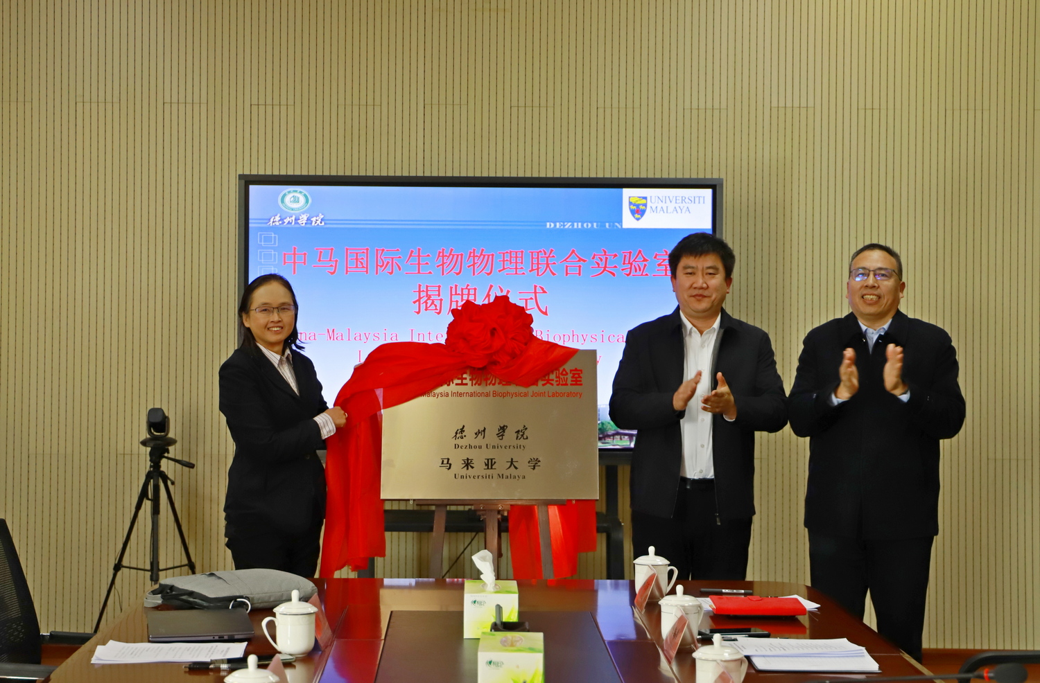 刘印房、杜海伟和陈盈朱共同为中马国际生物物理联合实验室揭牌。