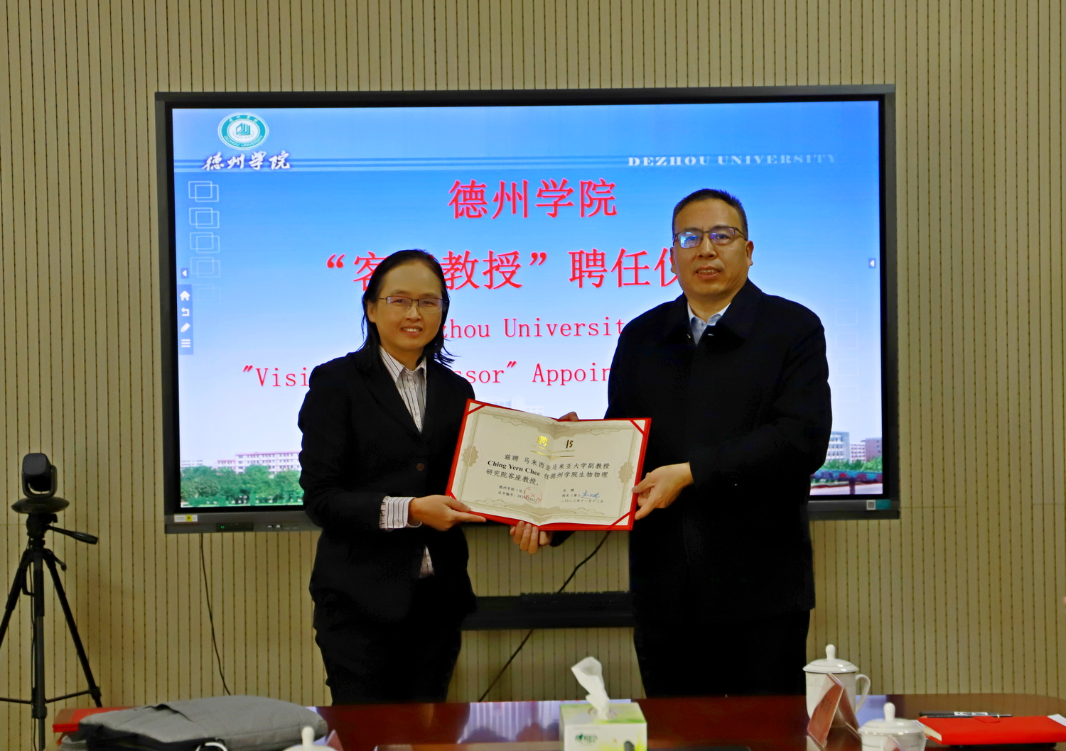 李甲亮宣读了客座教授聘任决定,刘印房分别为马来西亚专家蔡清福、陈盈朱、陈观蓉颁发了客座教授聘书。