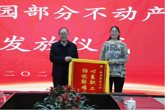 12月22日,学府家园部分不动产权证发放仪式在厚德楼第二报告厅举行。学校党委副书记张存峰、校工会全体人员、教职工代表参加仪式。