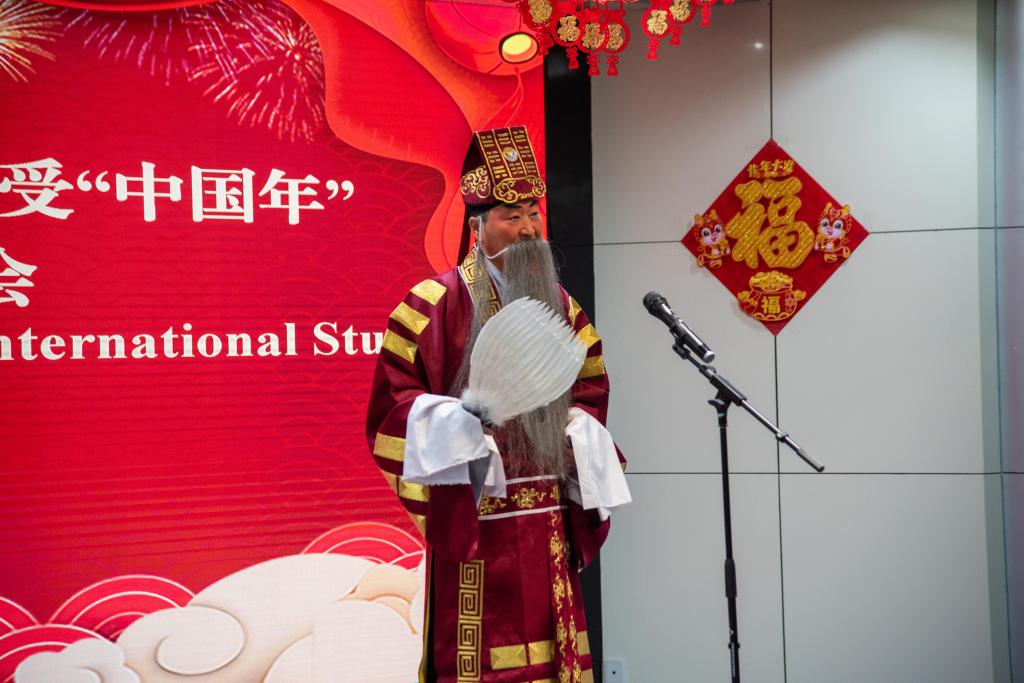 迎新春联欢会上,刘印房致辞。他祝各位留学生春节快乐,希望他们好好珍惜在中国学习的机会,不负时光,不负韶华。要做沟通中外友谊的桥梁,促进文明交流互鉴。