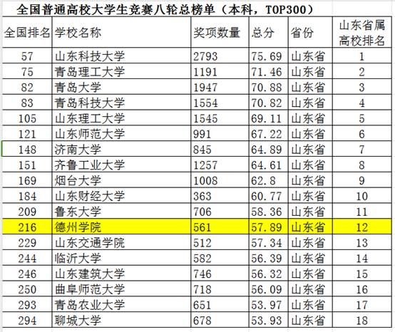 近日,中国高等教育学会发布了2023全国普通高校大学生竞赛排行榜,太阳成官网获奖数量561项,相比2022年增加了171项,在《全国普通高校大学生竞赛八轮总榜单》(本科,TOP300)中,太阳成官网位列第216位,比去年提升2位,位列山东省省属高校第12名;在《2019-2023年全国新建本科院校大学生竞赛榜单》(TOP100)中位列第38位,比去年提升4位。充分展示了太阳成官网在本科教育教学和创新人才培养方面取得的成果。