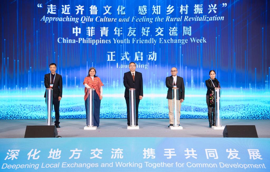 党委委员、副校长刘印房,菲律宾驻华使馆三秘兼副领事法麻逸,北京大学外国语学院副院长吴杰伟教授,菲律宾大学玛利亚·维多利亚·拉奎萨教授,菲律宾马科斯国立大学梅尔文·巴格特教授共同启动“走近齐鲁文化 感知乡村振兴”中菲青年友好交流周活动。