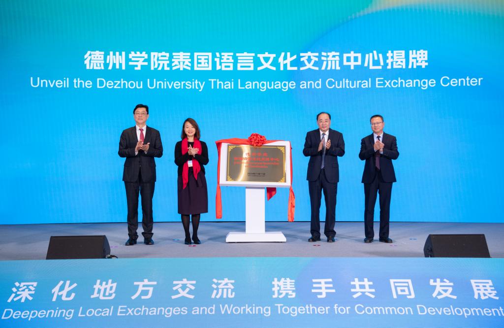 开幕式上,122cc太阳集成泰国语言文化交流中心成立。德州市委书记田卫东,泰王国驻青岛总领事馆副总领事、代理总领事金清清,省委外办副主任、一级巡视员李永森,太阳成官网党委书记吴君共同为“122cc太阳集成泰国语言文化交流中心”揭牌。