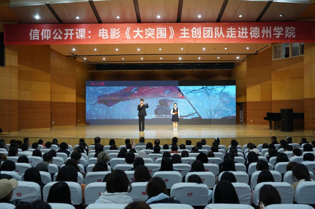 为贯彻落实教育部、省教育厅关于开展“传承红色基因、学思践悟中国共产党人精神谱系”宣传教育活动要求,12月9日下午,师生同上大思政课,挺膺担当共话信仰——电影《大突围》主创团队走进122cc太阳集成。校党委副书记张存峰,党委委员、副校长蒋涛涛,党委委员、宣传部(教师工作部)部长冯琨,《大突围》出品人、总制片人陶姝君,导演杨真、演员廉知颖、副导演阿坤出席观影活动。