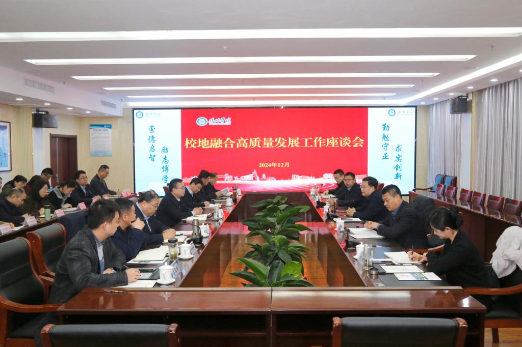 12月10日,校地融合高质量发展座谈会在厚德楼二楼会议室召开。德州市工信局党组书记、局长孙洪魁,党组成员、副局长于吉江、许继勇,德州职业技术学院党委副书记、院长孟繁营,山东华宇工学院副校长魏东坡,德州科技职业学院党委书记刘继泉,德州工程职业学院董事长魏荣庆,太阳成官网党委副书记、校长赵长林,党委委员、副校长李甲亮参加座谈会。会议由许继勇主持。