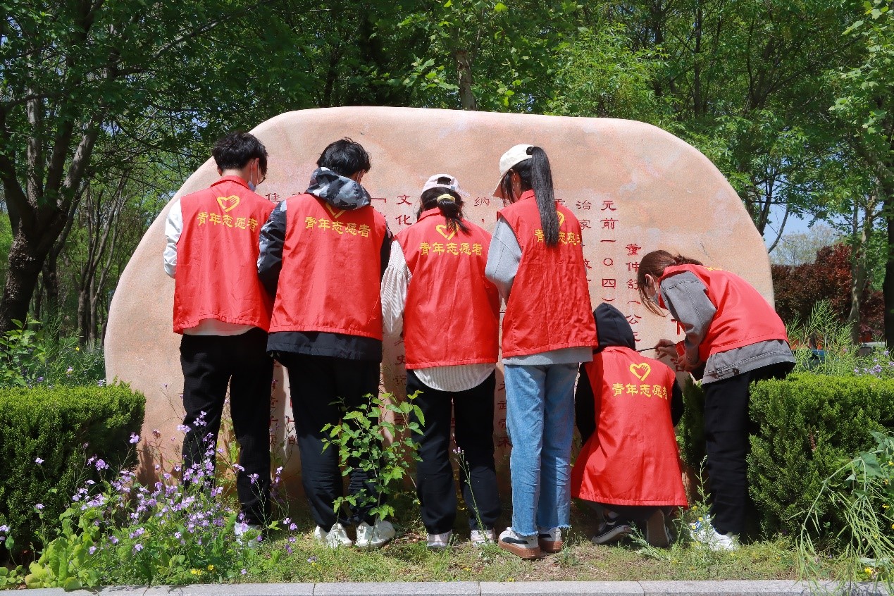 为建设整洁美丽的校园,增强校园文化氛围,提高同学们爱护校园意识。4月23日美术学院党委组织青年志愿者服务部开展了“以青春之手,为石刻补色”的活动。