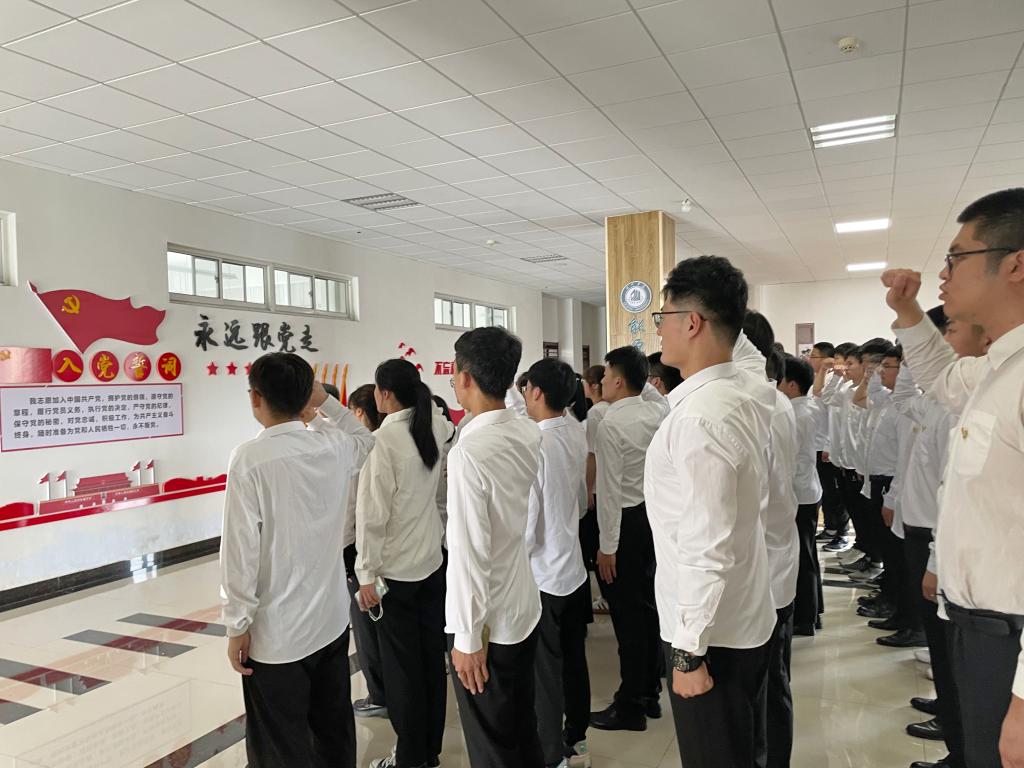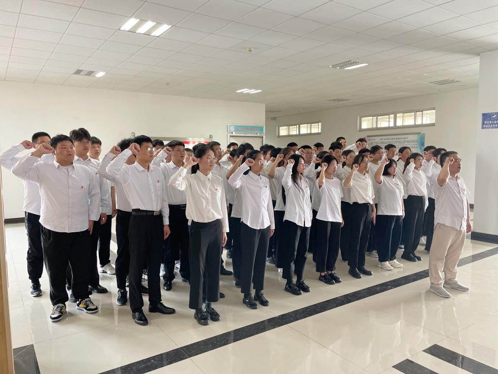 “我志愿加入中国共产党,拥护党的纲领,......,永不叛党。”能源与机械学院48名新发展党员面向党旗,举起右拳许下铮铮誓言。预备党员黄国栋代表新发展党员作表态发言,表示要牢记入党誓词,刻苦学习,努力工作,用实际行动履行党旗下的誓言,为党奉献自己终身。能源与机械学院党委负责人向新党员表示祝贺,并提出四点希望:一是要进一步端正入党动机,牢记入党誓词,做志存高远、有理想有信念的新青年。二是进一步加强理论学习,深入学习党的创新理论,不断提升政治素养。三是要进一步加强专业学习,练就过硬本领,以自己所长服务社会、报效国家。四是进一步发挥党员先锋模范作用,全面践行“全心全意为人民服务的”宗旨,争当时代先锋。
