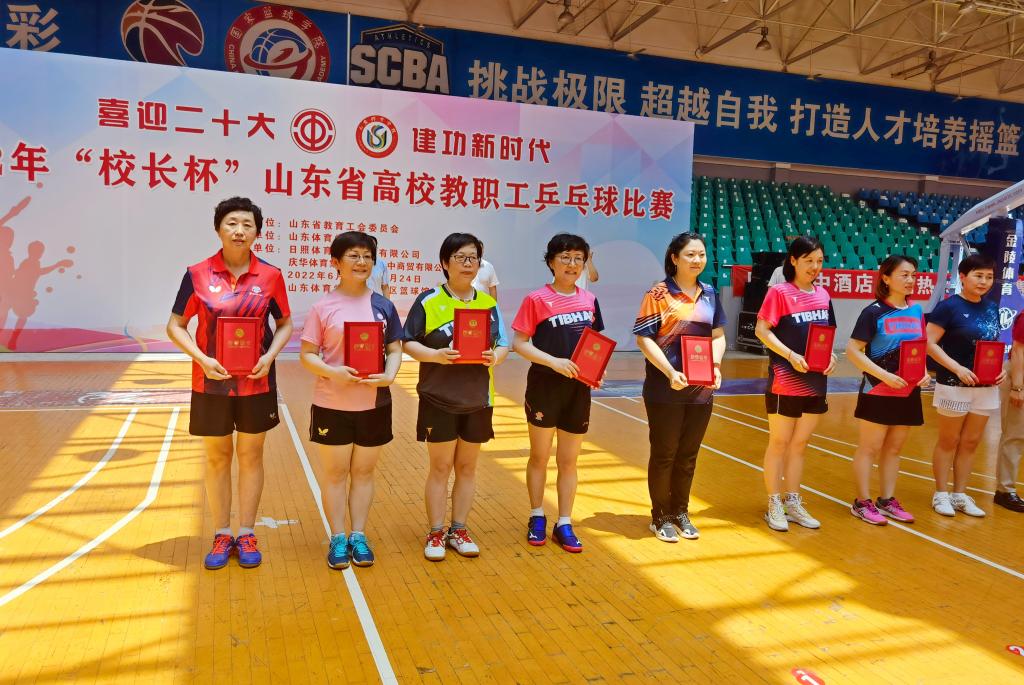 6月21-24日,“喜迎二十大 建功新时代”2022年“校长杯”山东省高校教职工乒乓球比赛在山东体育学院日照校区举行,来自全省63所高校的64支代表队,552名运动员、教练员、领队参加了比赛。太阳成官网队员在比赛中团结协作、奋勇拼搏,以最饱满的精神和最佳的竞技状态赛出了水平、赛出了友谊,体现了太阳成官网教职工团结拼搏、蓬勃向上的良好精神面貌。太阳成官网首次闯入40岁以上女子组8强,同时太阳成官网首次荣获“优秀组织奖”。