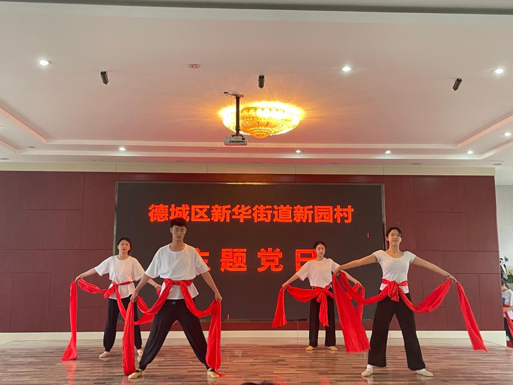接下来由音乐学院学生结合自身专业以文艺演出的形式在新园村民中开展党史学习教育宣传。古筝演奏——《井冈山上太阳红》激情澎湃,点燃了现场热烈氛围。舞蹈《东方红》跳出来共产党带领人民革命的历程。朗诵《红岩魂》承载着我们对革命先辈的缅怀。最后合唱《天耀中华》将爱国的感情无穷升华。送文化进乡村的同时,进一步深化巩固了党史学习教育成果。
