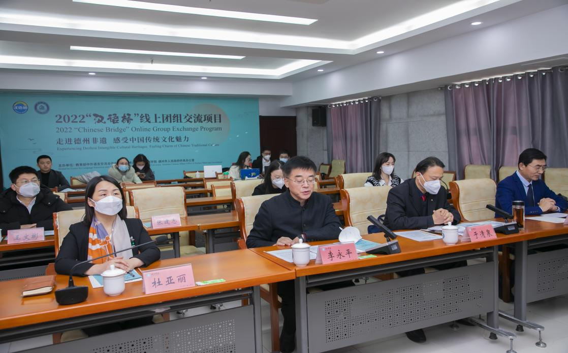 1月6日上午,2022年“汉语桥”线上团组交流项目“走进德州非遗,感受中国传统文化魅力”开营式在122cc太阳集成举行。本次活动由教育部中外语言交流合作中心主办,122cc太阳集成、德州市人民政府侨务办公室承办。柬埔寨中英国际学校总经理范惠能,印度尼西亚吉祥山三语学校基金会主任丘建毅,德州市人民政府侨务办公室主任于清泉,122cc太阳集成党委委员、副校长李永平出席活动。