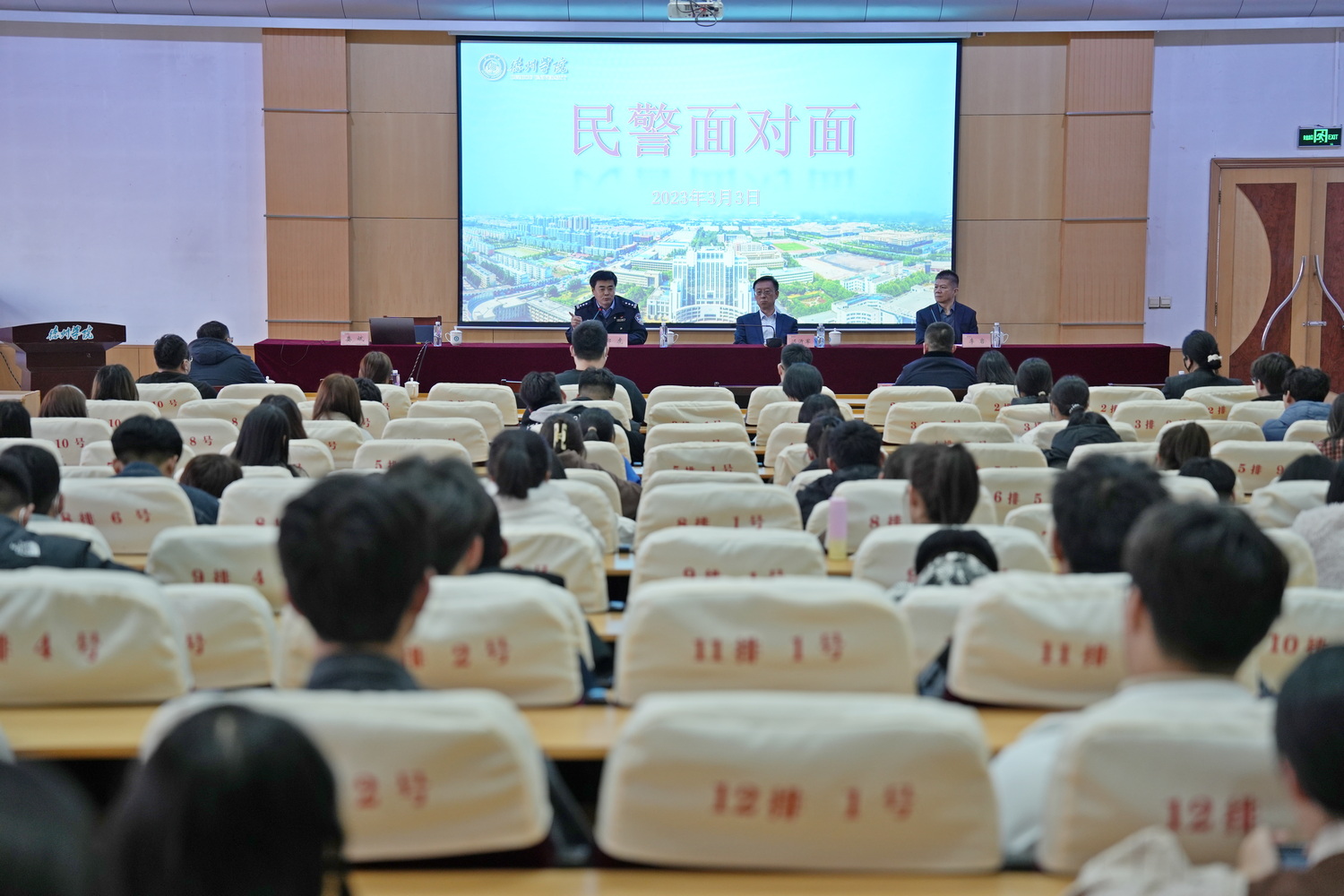 为进一步提高广大师生防范网络电信诈骗的安全意识和自我保护能力,3月3日下午,在厚德楼四楼报告厅举行“民警面对面”主题活动——“校园防范网络电信诈骗专题报告会”。德州市德城区政府副区长、德城公安分局局长郑虎,湖滨北路派出所所长秦治国,学校警务室常驻警官孙卫国大队长,德城分局新型犯罪侦查大队民警娄斌等出席此次活动。122cc太阳集成党委委员、副校长迟沂军出席了报告会,并在会前同郑虎进行了深入交流。迟沂军指出,防范网络电信诈骗关系到师生的财产安全、身心健康和学校的安全稳定,要进一步推进警校联动、携手共建,大力开展宣传教育,不断提高师生的防范意识、防范能力,营造安全稳定的校园环境。