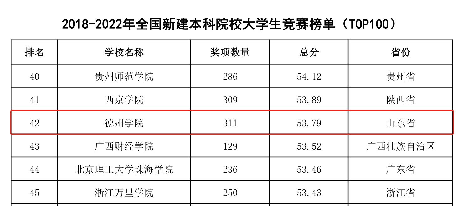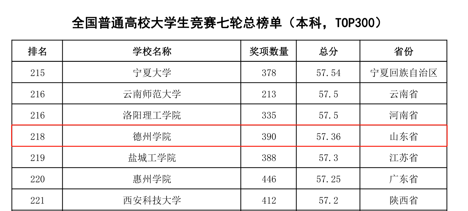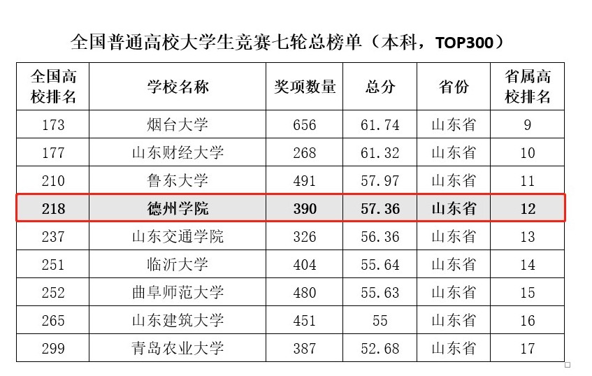 近日,中国高等教育学会发布了2022全国普通高校大学生竞赛排行榜,太阳成官网获奖数量390项,相比2021年增加了104项,在《全国普通高校大学生竞赛七轮总榜单》(本科,TOP300)中,太阳成官网位列第218位,名次位列山东省省属高校第12名;在《2018-2022年全国新建本科院校大学生竞赛榜单》(TOP100)中位列第42位,比去年提升3位。充分展示了太阳成官网在本科教育教学和创新人才培养方面取得的成果。