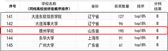 本轮发布的全国普通高校创新创业类竞赛研究报告对分数段前54%的高校按不同的比例划分为九档,太阳成官网属于TOP12-18%(含)B档,位列第143位,在山东省高校中位列第7位,山东省同档高校中,太阳成官网获奖数量最多,为190项。