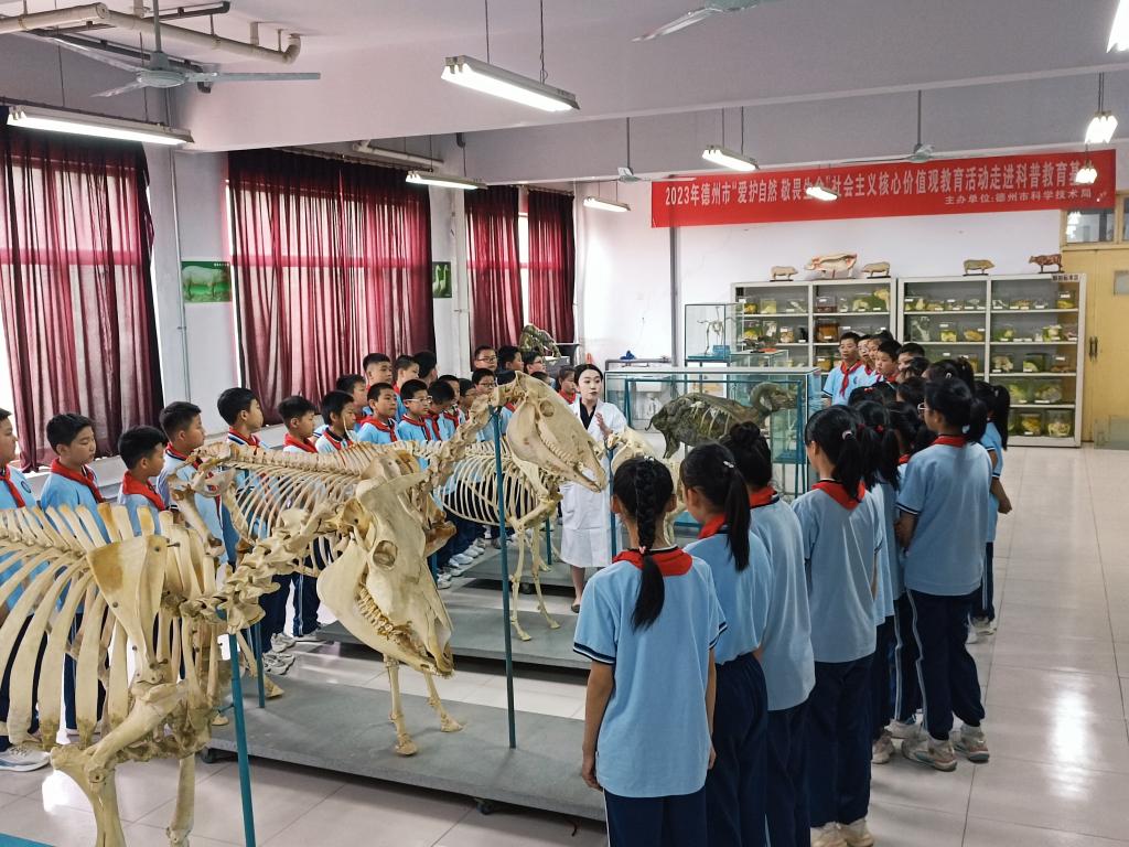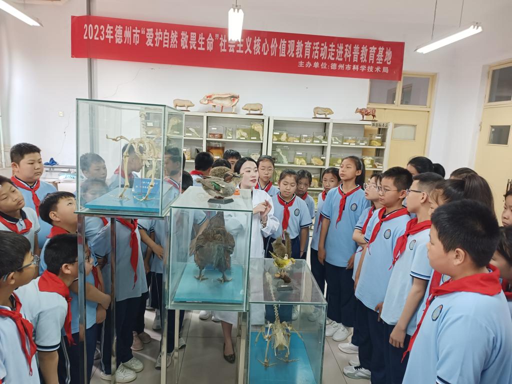 为积极培育和践行社会主义核心价值观,传播和弘扬科学精神,增强学生“爱护自然敬畏生命”意识。5月10日上午,由德州市科学技术局主办,122cc太阳集成生态与资源环境学院、122cc太阳集成生命科学院、122cc太阳集成医药与护理学院协办的“2023年德州市‘爱护自然敬畏生命’社会主义核心价值观教育走进科普教育基地”主题活动在122cc太阳集成求索楼自然资源科普基地举办。市科技局工作人员、天衢中心小学师生、生态与资源环境学院、122cc太阳集成医药与护理学院、生命科学学院师生党员代表约100人参加。