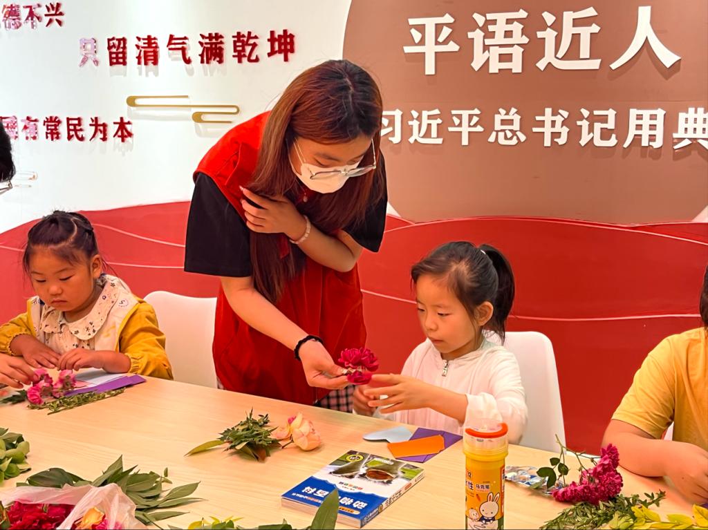 志愿者从《闪闪的红星》《雷锋的故事》两本红色书籍中精心摘选精彩章节,为社区青少年进行现场解读,深刻感悟革命先辈们不畏艰险、不怕牺牲的大无畏精神和坚定信念,引领他们弘扬光荣革命传统、赓续红色血脉,争做时代新人。随后,志愿者向小朋友们介绍了植物书签的制作流程和注意事项,并为他们发放各种花草、卡纸及制作工具,小朋友们充分发挥想象力进行搭配,将热爱文字、美学、创造之情寄予方寸书签,俨然成了一件件精美的艺术品。