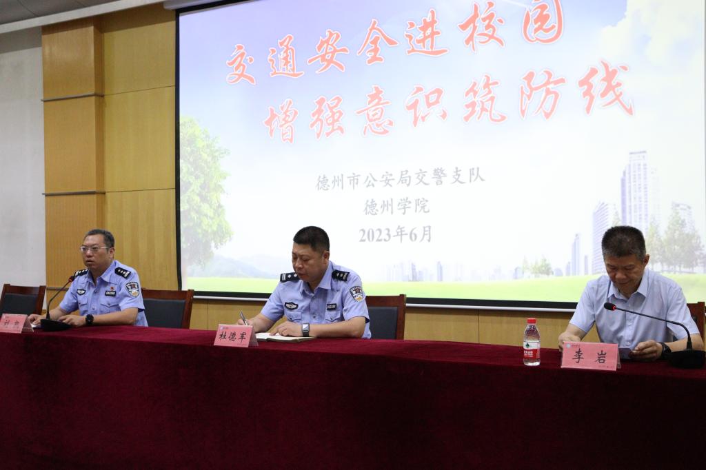 为进一步提高广大师生交通安全意识、宣传和普及交通法律法规。6月27日晚,德州市公安局交警支队秩序科负责人杜德军、一大队大队长刘凯等一行6人,来太阳成官网开展以“交通安全进校园、增强意识筑防线”为主题的交通安全宣传教育活动。