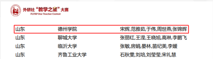 近日,2023年外研社“教学之星”大赛全国复赛成绩揭晓,外国语学院选派的由宋辉、范雅茹、于伟、周世燕、张锦辉组成的大学英语组参赛团队和由龙娜娜、胡晓莉、史青玲、程福梅、孙艳华组成的英语专业组参赛团队,凭借流畅的教学流程、科学的教学设计、扎实的教学功底和出色的课堂展示,分别荣获大学英语组和英语专业组一等奖。