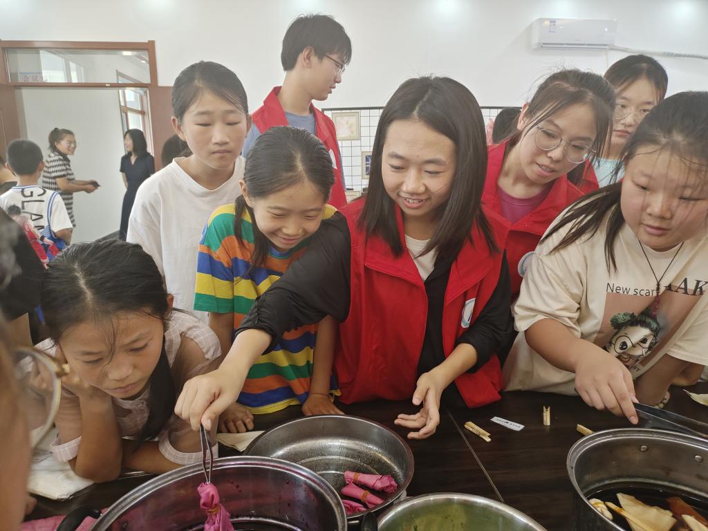 暑期“三下乡”活动开始后,社会实践团学生对企业职工子女开展纺织红色基因理论宣讲以及扎染互动课程,让职工子女看到父母对纺织业有“择一事终一生”的执着专注、“偏毫厘不敢安”的一丝不苟、“千万线成一布”的追求卓越,激发青少年投身纺织业的兴趣,强健纺织业人才“造血能力”。