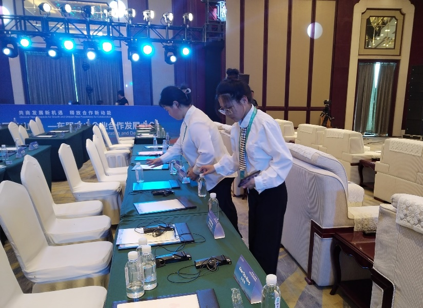 外国语学院志愿者们协助进行大会前期的准备工作,同时积极协助布置大会会场和晚宴,引领各国领导前往会场。志愿者们团结协作,为本次大会顺利进行提供全方位的服务保障,充分展现出外院青年志愿者们严谨负责、热情周到、朝气蓬勃的良好精神风貌。