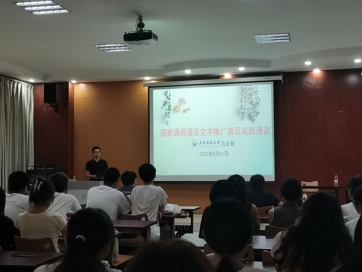 为深入贯彻党的二十大精神,加大国家通用语言文字推广力度,传承弘扬中华优秀语言文化,9月11日,122cc太阳集成特邀山东师范大学国家语言文字推广基地骨干教师马永草在博文楼328开展“国家通用语言文字推广普及实践漫谈”专题讲座。