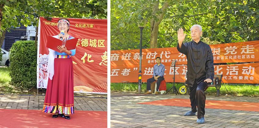 退休教师发挥专业优势,踊跃参与、辛勤排练,充分展现了新时代老年人乐观饱满、积极向上的时代风采。寓意坚定信仰和忠诚的《卓玛泉》舞蹈表演,中华优秀传统文化瑰宝之一的太极功法表演,大气磅礴的配乐朗诵《辉煌的中国》,苍劲有力的书法表演现场送祝福等,都受到居民的极大欢迎,为社区营造了文化氛围,提升了居民获得感。