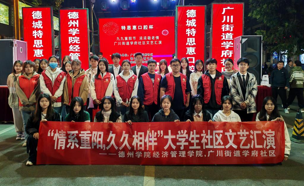 在重阳节到来之际,为丰富社区群众的精神文化生活,营造尊老、爱老、助老的良好氛围,组织好“百万大学生进社区”实践活动,扎实开展好大学生社区实践计划。10月19日,经济管理学院联合广川街道学府社区开展“情系重阳,久久相伴”社区文艺汇演活动。