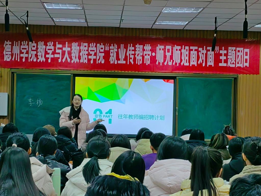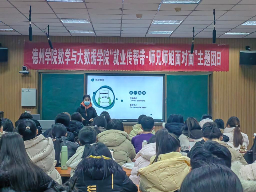 为了指导学生进行职业生涯规划,激发学生就业与考研的意识,数学与大数据学院于12月1日在厚德楼413教室举办“就业传帮带·师兄师姐面对面”校友沙龙活动。本次活动邀请了数学与大数据学院优秀毕业生、校友代表2018级数据科学与大数据技术专业鹿杰琼和数学与应用数学专业的段春玲担任主讲嘉宾。活动有相关专业120名学生参加。