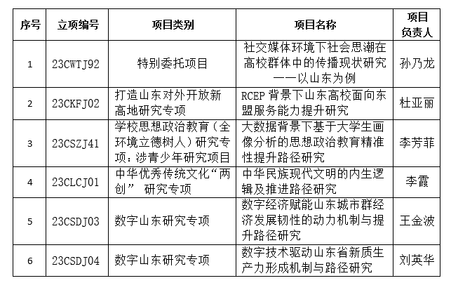 近日,山东省哲学社会科学工作办公室公布了2023年度山东省社科规划研究项目立项名单,太阳成官网1项特别委托项目和5项专项获批立项。专项项目类别涉及打造山东对外开放新高地研究、学校思想政治教育(全环境立德树人)研究、中华优秀传统文化“两创”研究、数字山东研究等四个专项。