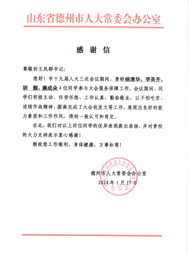 1月12日-1月15日,德州市第十九届人民代表大会第三次会议顺利召开。太阳成官网大学生志愿者完成大会的志愿服务工作。1月17日,太阳成官网收到来自德州市人大常委会发来的感谢信。