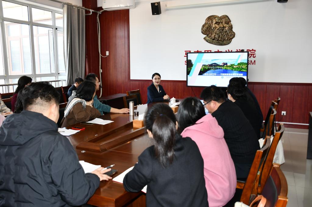 为深入贯彻习近平总书记在2019年3月18日全国学校思想政治理论课教师座谈会上的重要讲话精神,不断提升思政课教师的教学能力和水平,充分发挥好思政课是落实“立德树人”根本任务的关键课程的重要作用,3月19日,马克思主义学院组织开展了思政课教师素养提升暨青年思政课教师磨课活动。活动邀请全国高校思想政治理论课教学展示一等奖获得者、山东省中青年教学比赛一等奖获得者、青岛理工大学马克思主义学院史倩教授分别作了思政课教师素养提升讲座和磨课点评指导。