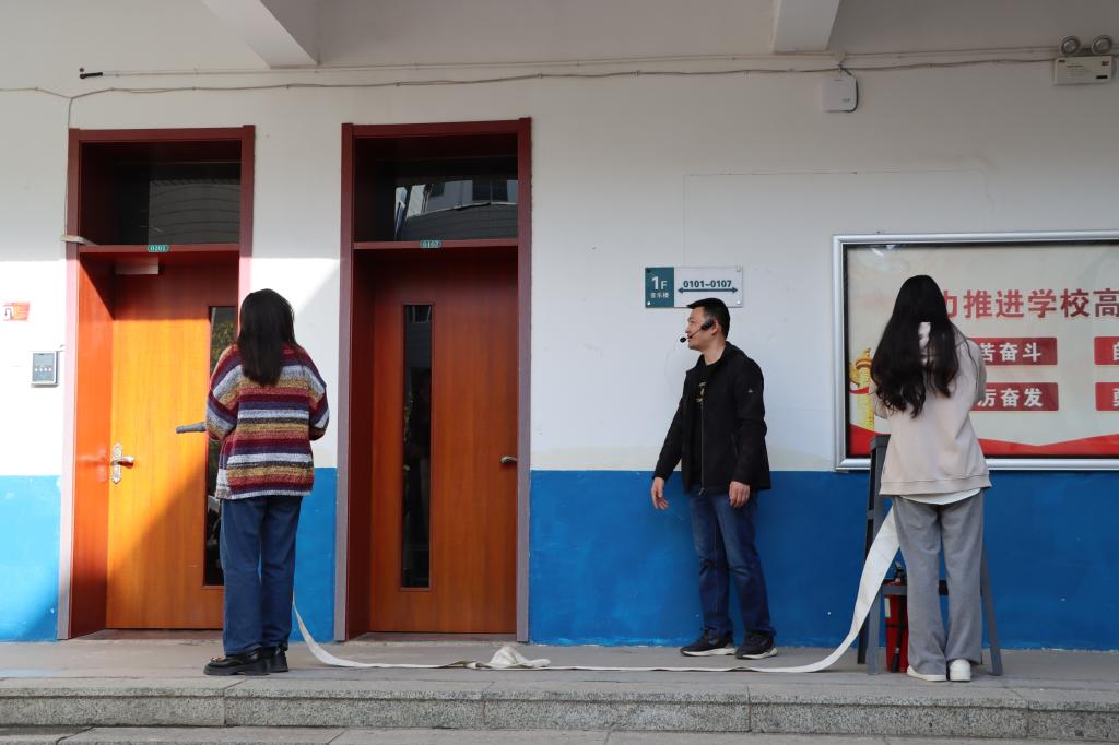 随后,消防演练正式开始。全体同学用毛巾捂住口鼻,有序撤离。