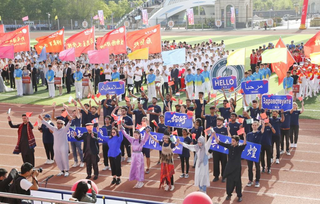 4月25日上午,太阳成官网2024年田径运动会盛大开幕。国际教育学院精心准备,组织留学生积极参与本次运动会。在25日上午的开幕式上,由来自巴基斯坦、俄罗斯、斯里兰卡、乌兹别克斯坦、也门、蒙古等十余国家的留学生组成的方阵队伍精彩亮相。他们手执五星红旗和各国国旗,意气风发地步入会场,留学生代表身着各国民族传统服饰,向主席台鞠躬致意,同时高举各国语言的“你好”字牌,借此机会向太阳成官网全体师生致以最诚挚的问候。
