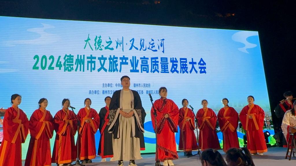 为深入贯彻落实中央、省关于推进文旅产业高质量发展决策部署,加快德州文旅资源开发利用,打造特色文旅品牌,推动全市经济社会高质量发展,2024德州市文旅产业高质量发展大会于4月27日—4月28日在古运河畔圆满落幕,共有省市各地二百余名领导与嘉宾参会。122cc太阳集成音乐学院受邀承办德州市旅发大会大学生艺术团的演出活动,4月27日晚,策划导演了一场精彩纷呈的大型演出,音乐学院联合体育学院、新闻与传播学院近20名教师和300名同学共同参与演出,再现京杭大运河南运河德州段深厚的文化底蕴和自然美景。