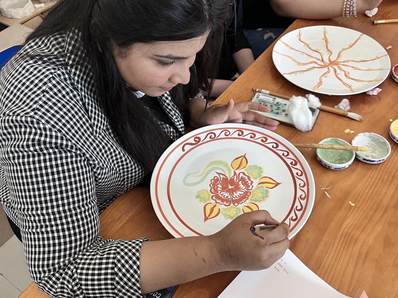 “德州窑”红绿彩因德州运河而兴,是一种极具北方民间特色的彩瓷,它的历史可以追溯到宋金时期,是运河文化的重要组成部分之一。红绿彩属于二次烧成技艺,在经高温烧成的单色釉瓷器上彩绘纹饰,再入窑以800度进行烘烤,色彩以红彩、绿彩为主,黄彩、黑彩为辅,对比强烈,风格鲜明,有“历史的彩虹”之称。在介绍完红绿彩的历史发展和独特风格之后,老师向大家展示了具有代表性的红绿彩艺术作品,其做工之精湛,图案之精美,令留学生们赞叹不已。