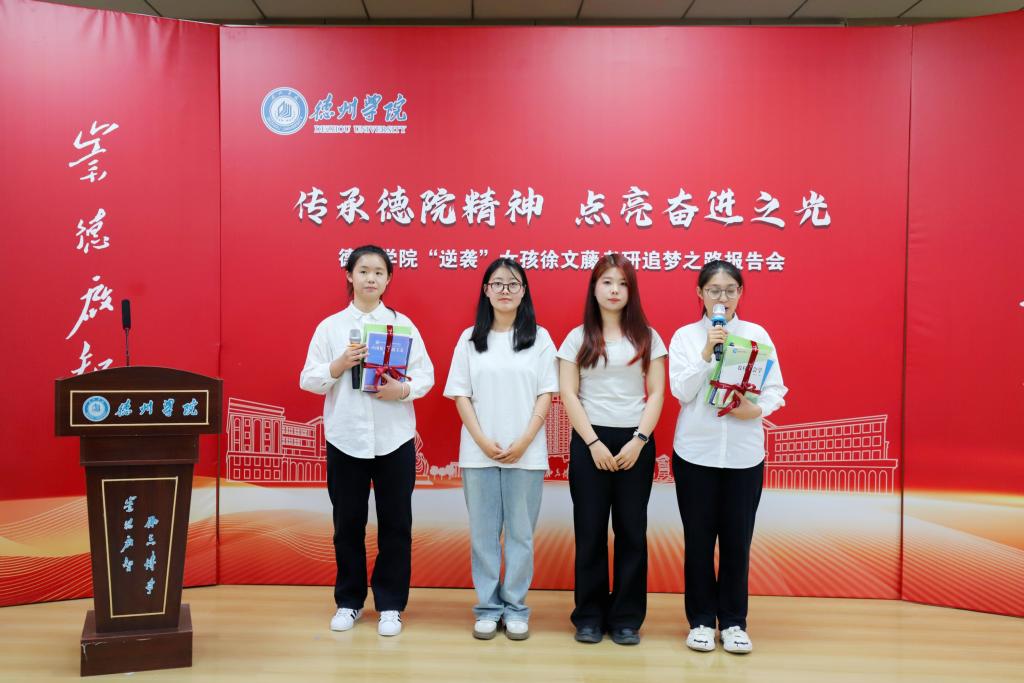 徐文藤从自身考研经历出发,围绕择校、复习计划、备战心态等为同学们提供自己的上岸经验。她表示择校是考研的重要阶段,选择大于努力,要根据学校的层次、所在城市、文理分类等选择适合自己的学校。同时还要保持良好的考研心态,脚踏实地高效复习,不断接近目标,最终实现目标。报告会后,徐文藤向母校学弟学妹赠予考研书籍和考研笔记。将书籍留在母校,以此纪念青春岁月中美好的读书时光,以笔记传承“崇德启智、励志博学”的德院校训精神。在校生代表深情演唱《追梦赤子心》,以真挚的歌声致敬每一位奋斗者对梦想的追求。