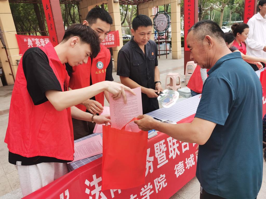 6月21日,法学院联合德城区委政法委、区法学会在区法治文化广场开展“青年普法志愿者法治文化基层行”法律服务宣传活动。同时来自区法院、区检察院、区公安分局、区司法局、新湖街道普法志愿者共30余人参加活动。