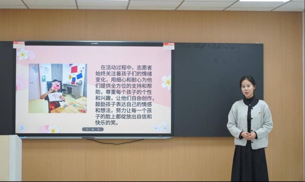 教师教育学院团支部以“手语天使,点亮心灯——听障儿童志愿服务活动”为主题进行分享。该活动结合专业特色,以专业技能为依托,让同学们走进社区,走进德州市育红听力康复中心,将所学知识融入到社会实践中,通过多样化的教学形式为听障儿童带去快乐。“点亮星灯,与爱同行”志愿服务团队分享了在新语特教中心开展活动的所思所想所感,以及志愿者如何通过舞蹈、手部操、做手工等活动充分调动孩子们的积极性。同时,志愿者还分享在活动过程中如何关注孩子们的情绪变化,如何通过细心和耐心为他们提供全方位的支持和帮助,尊重每个孩子的个性和兴趣,让他们自由创作,鼓励孩子表达自己的情感和想法,努力让每一个孩子的脸上都绽放出自信和快乐的笑容。该团队也呼吁大家让更多的人认识和了解到自闭症,提高了社会对自闭症儿童的包容及接拿程度,帮助特殊群体儿童更好融入社会生活。