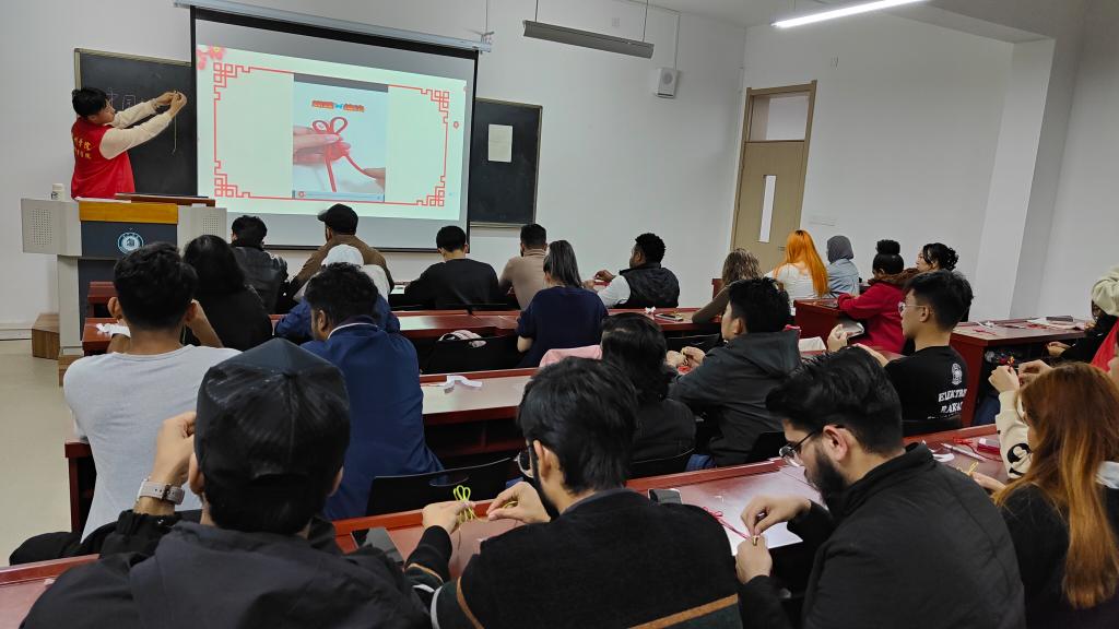 10月18日,国际教育学院开展“中国文化体验活动”,来自俄罗斯、巴基斯坦、乌兹别克斯坦等国家的近50名留学生共同学习编制中国传统手工艺品——中国结。