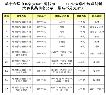 近日,由山东省科技厅、山东省教育厅等单位联合主办,山东地理学会承办的第十六届山东省大学生科技节——山东省大学生地理创新大赛获奖名单正式揭晓。在地理教学创新赛道,生态与资源环境学院参赛团队凭借扎实的专业知识、出色的教学创意和精湛的展示能力,获一等奖3项、二等奖3项。在地理科技创新与社会实践赛道,生态与资源环境学院团队同样凭借优秀的项目成果获得二等奖1项、三等奖4项。